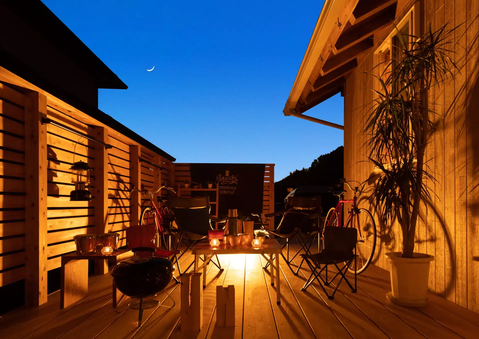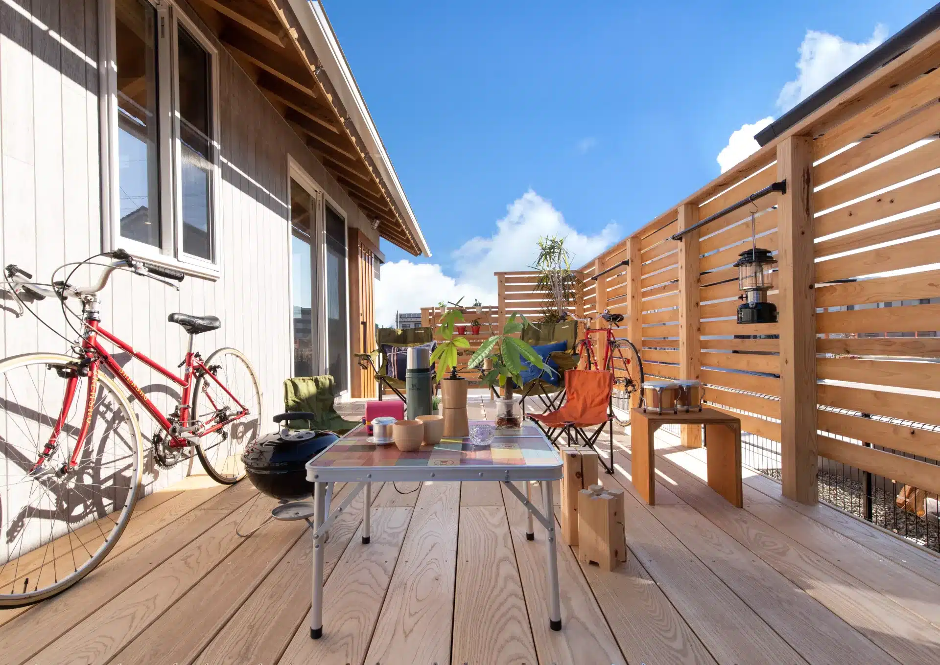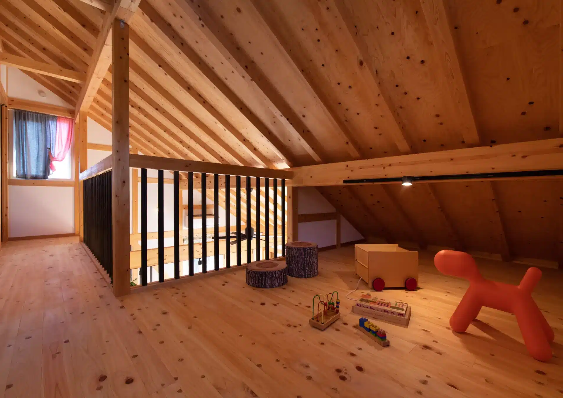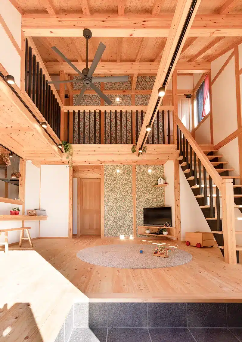解放感のある吹き抜けと、リビング階段。天井と床にもヒノキをふんだんに使用し、木の温もりが体感できるモデルハウスです。二階建てになっており、1階と2階で雰囲気を変えています。さまざまな木の表情を楽しんでいただける空間になりました。玄関の横には、ウッドデッキを設置し、ベランダでBBQなどを楽しめます。木の香りとともに過ごす家をぜひご覧ください。