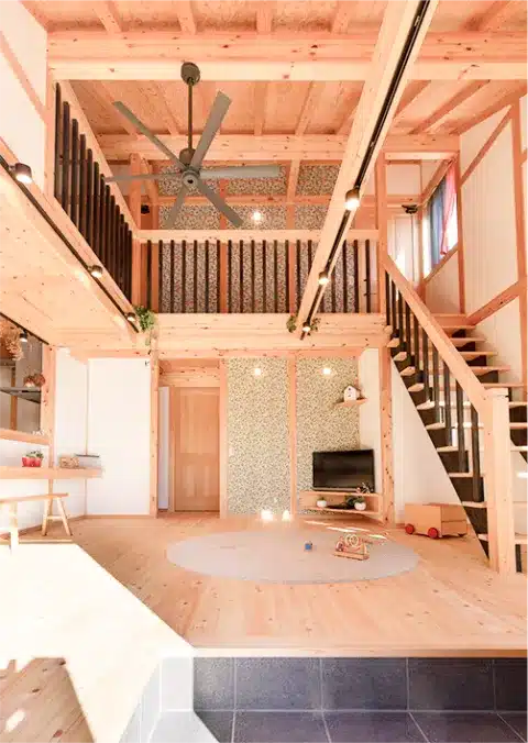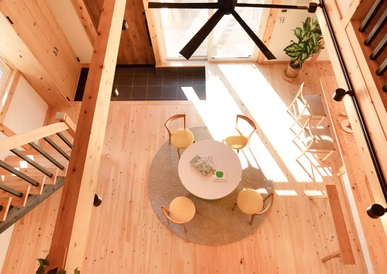 縦に広がる吹き抜けは、家全体に自然の光と風を効率よく取り込みます。開放的で明るい空間は、家族が集う場所を心地よく包み込み、四季を通じて快適な暮らしを実現します。