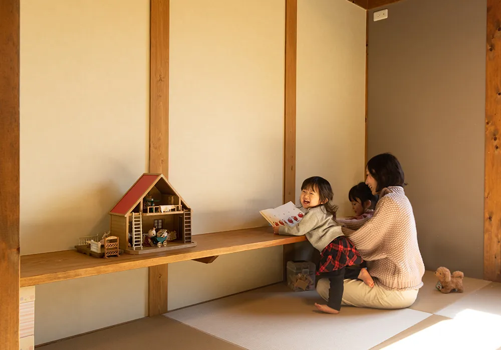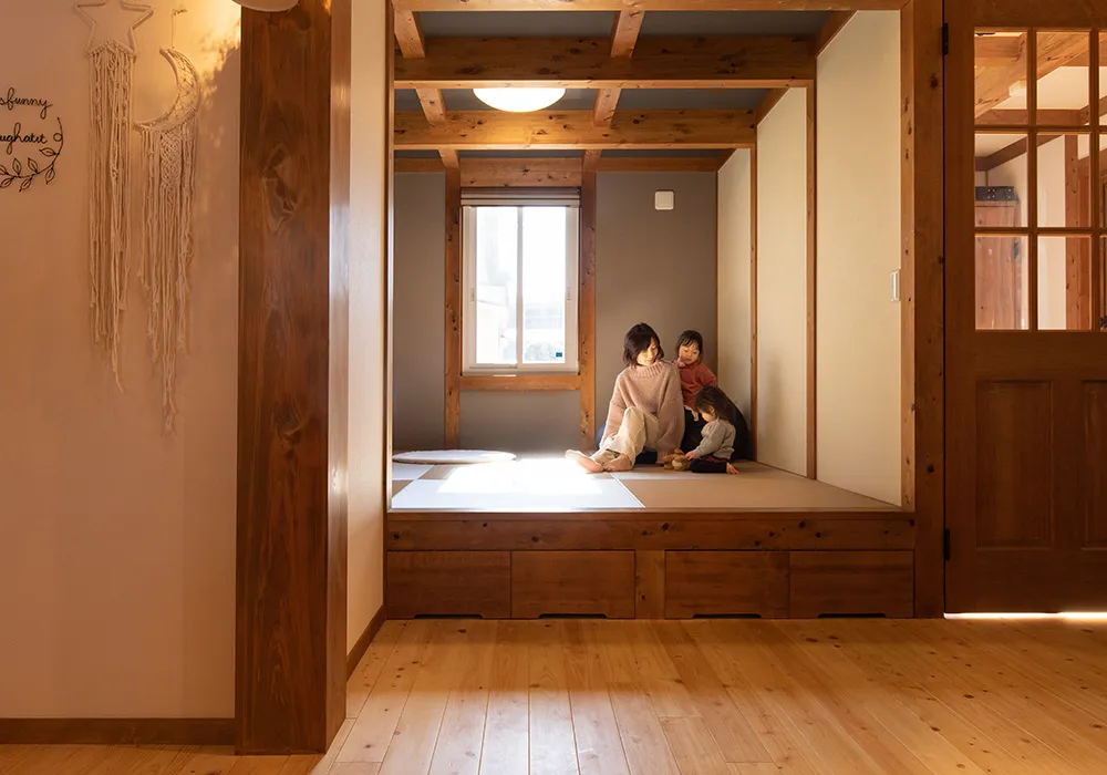 LDKをL字型にして、出っ張り部分を小上がりの畳コーナーに。リビングとのつながりを持ちつつ個室の雰囲気もあるので、客間や一人静かに過ごしたい時にも最適です。